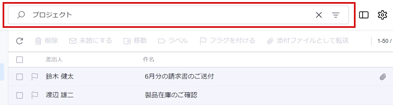 2「Enterキー」または「Returnキー」を押下すると、キーワードを含むメールの一覧が表示されます。